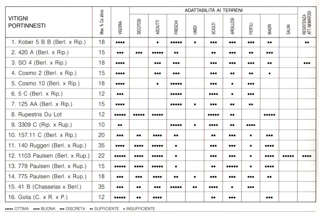 Kober 5 B B, 420 A, SO 4, Cosmo 2, Cosmo 10, 5 C, 125 AA, Rupestris Du Lot, 3309 C, 157.11 C, 140 Ruggeri, 1103 Paulsen, 775 Paulsen, 41 B, Golia.